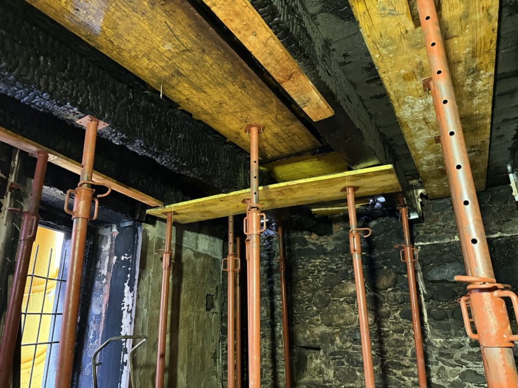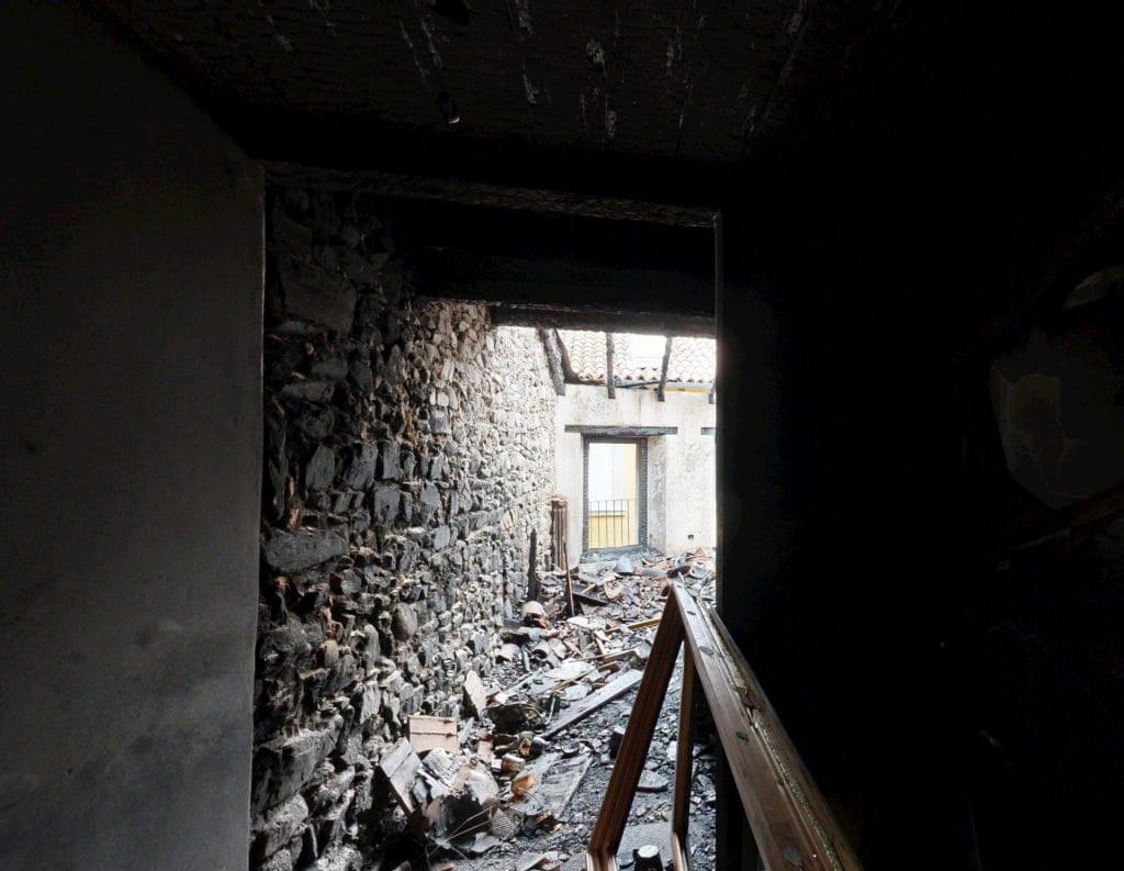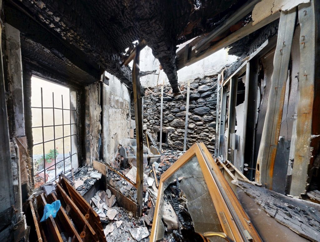 In parallelo, si procede con la rimozione controllata e lo sgombero di tutto il materiale compromesso dall’incendio. Arredi, macerie ed elementi pericolanti vengono rimossi, preparando le aree alle successive fasi di intervento.